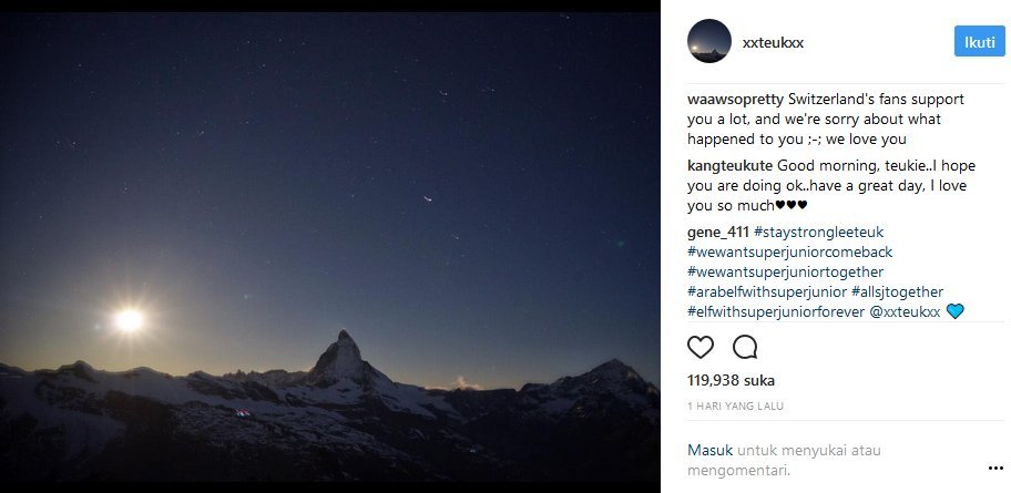 Selang beberapa hari setelah kejadian naas tersebut, cowok berlesung pipit ini memberi kabar soal kondisi terkininya melalui akun Instagram. "Aku kembali dengan aman dari Swiss. Ini adalah ketiga kalinya aku mengunjungi negara tersebut sejak aku ditunjuk jadi duta wisata Swiss. Aku bahkan merasa sangat familiar dan tertarik," terang Leeteuk.