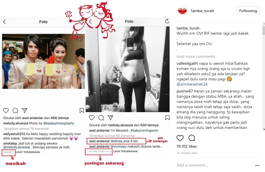 Menurutnya, saat menikah pada Maret lalu, usia kandungan sang menantu sudah menginjak 2 bulan. "(jd ga ush di tandai pake wrn merah tulisan nya..jd bikin orang2 pd ngitung pas nikah udh ada calon cucu sy usia kandungan 2bln)," katanya lagi.