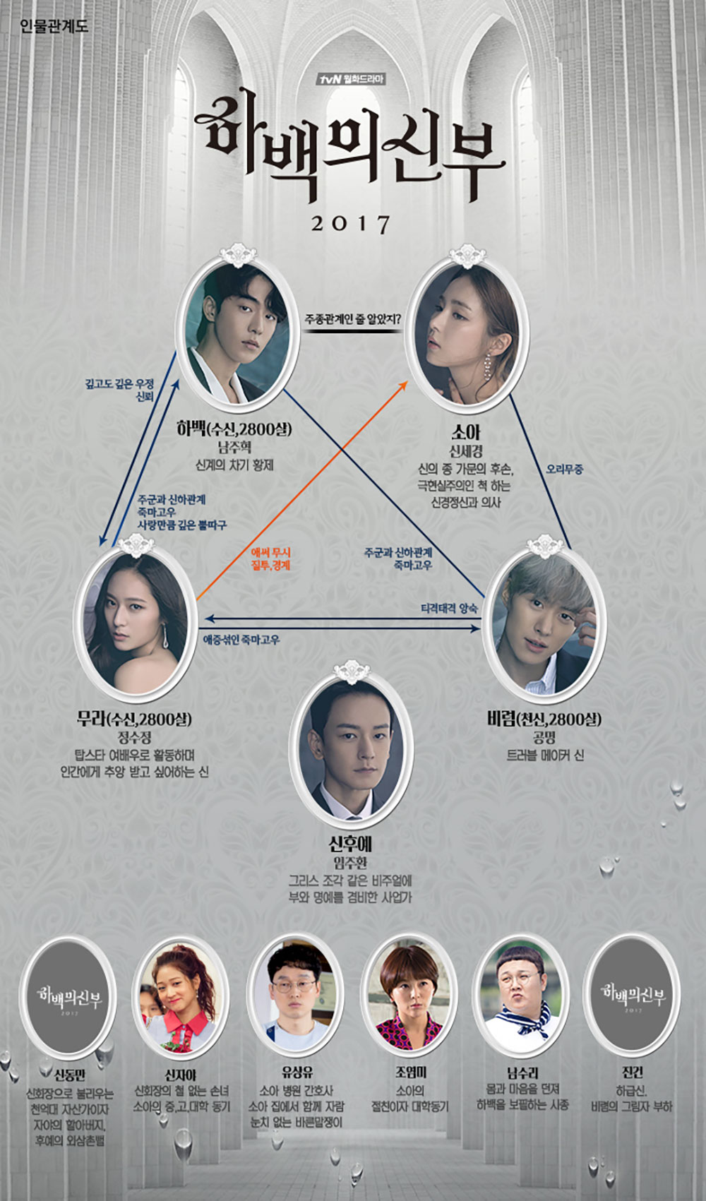 Sisa karakter pendukung juga tidak memiliki hubungan yang dipetakan namun disertai deskripsi karakter singkat. Nam Soo Ri (diperankan oleh Park Gyu Sun) akan menjadi karakter kocak yang berperan sebagai kaki-tangan sekaligus pelayanan Habaek saat datang ke dunia manusia. Sementara Yoo Sang Yoo (diperankan oleh Shin Jae Hoon) adalah seorang perawat di rumah sakit So Ah yang tidak memiliki rasa bijaksana dan kejujuran.