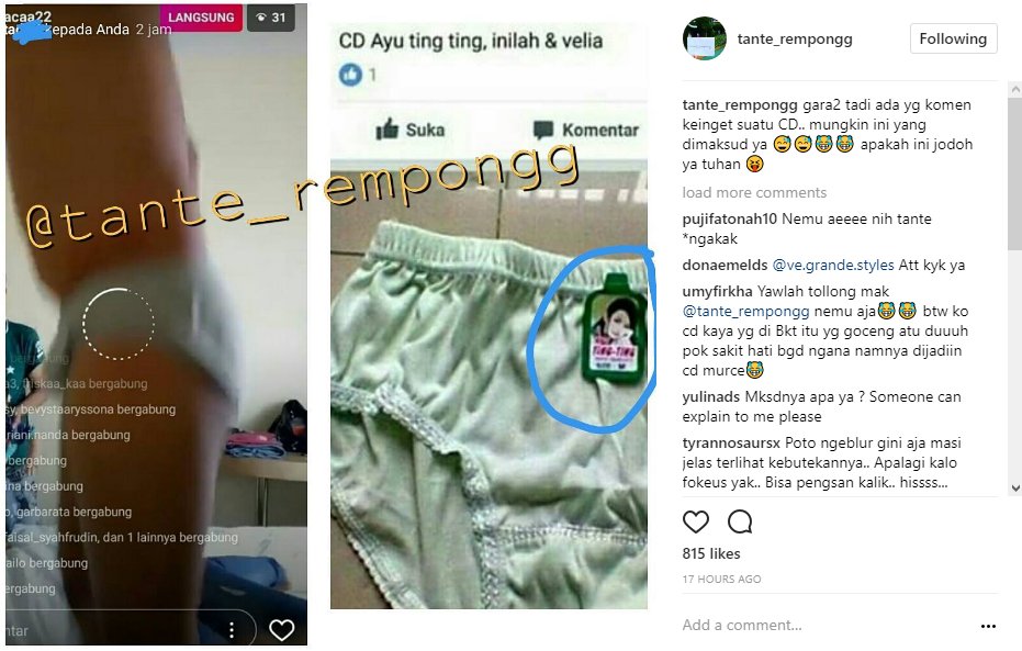Tak hanya itu, publik semakin dihebohkan lantaran Andika Eks Kangen Band disebut mengenakan celana dalam merek "Ayu Ting Ting". "gara2 tadi ada yg komen keinget suatu CD.. mungkin ini yang dimaksud ya apakah ini jodoh ya tuhan," tulis akun @tante_rempongg dalam caption postingannya.