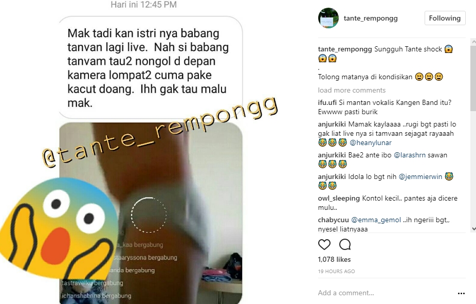 Lebih mengejutkan, Andika hanya mengenakan celana dalam saat siaran langsung. "Mak tadi kan istri nya babang tamvan lagi live. Nah si babang tamvan tau2 nongol d depan kamera lompat2 cuma pake kacut doang. Ihh gak tau malu mak," tulis narasumber.