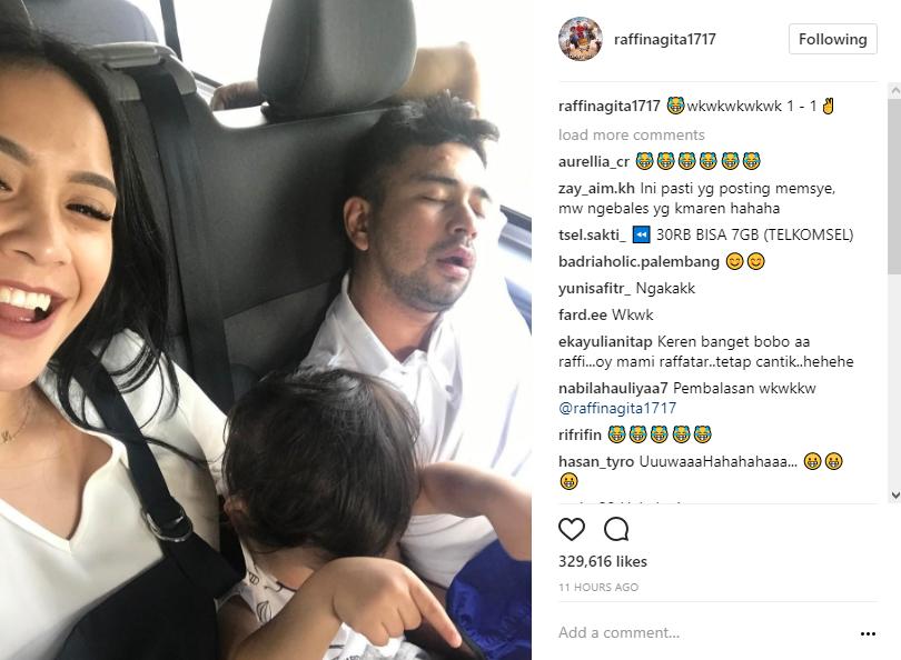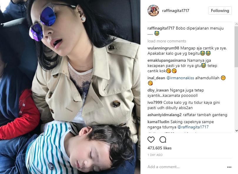 Mula-mula, Raffi seolah sengaja membagikan foto saat Nagita tengah terlelap dengan gaya menganga. Sambil mengenakan kacamata hitamnya, Nagita tampak terlelap dengan Raffathar berada di pangkuannya.