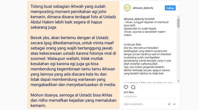 Egi pun meminta maaf atas ketidaknyamanan itu melalui Instagram Story miliknya. "Afwan yaa Al Ustadz Abdul Hakim ibn Amir Abdat Abu Unaisah sungguh saya (egi) tidak bisa mengontrol ikhwah atau pers yang foto foto dari jauh lalu upload (tanpa izin) karena terlalu gembira dan senang melihat langsung dari dekat gurunya dan dalam keadaan baik sehat dan bersahaja," ungkap Egi John.