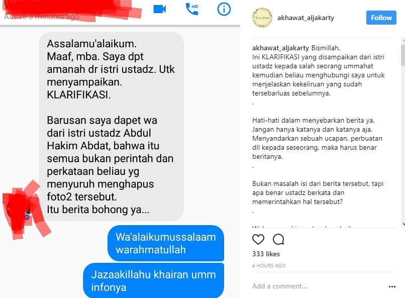 Menurutnya, perkataan sang ustadz yang meminta untuk menghapus foto tersebut adalah kebohongan belaka. "Barusan saya dapet wa dari istri ustadz Abdul Hakim Abdat, bahwa itu semua bukan perintah dan perkataan beliau yg menyuruh menghapus foto2 tersebut. Itu berita bohong ya..." imbuhnya.