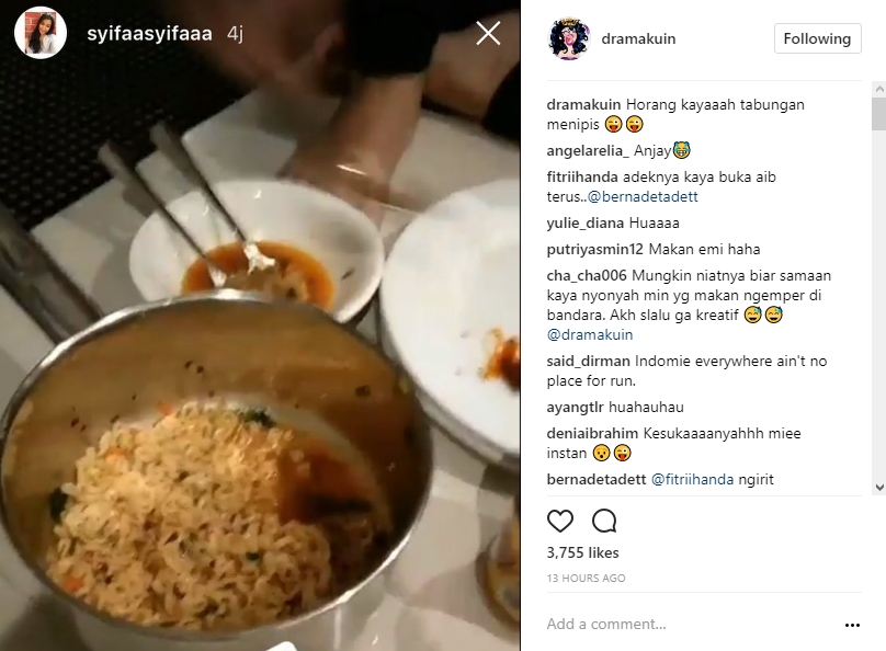 Melalui postingan di Instagram Story milik Syifa yang diunggah ulang oleh akun @dramakuin, tampak mereka tengah menikmati mie instan. Bahkan, mereka juga terlihat makan di lantai hotel. "Horang kayaaah tabungan menipis," tulis akun @dramakuin dalam caption postingannya.