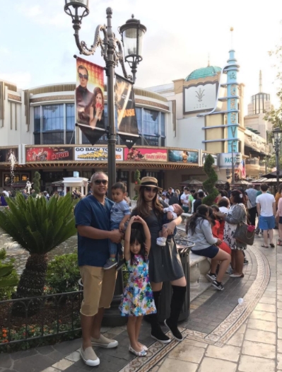 Sambil membawa stroller besar, keluarga Bakrie ini nampak menikmati panasnya cuaca Amerika.