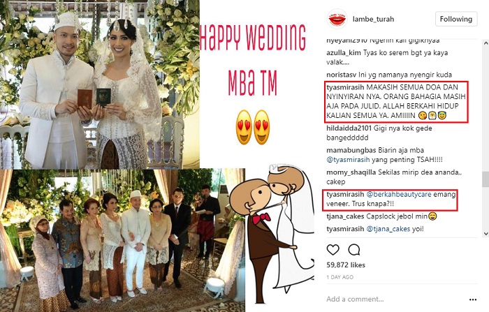 Seolah tak tahan dengan komentar nyinyir netizen, Tyas pun menganggapinya. "MAKASIH SEMUA DOA DAN NYINYIRAN NYA. ORANG BAHAGIA MASIH AJA PADA JULID. ALLAH BERKAHI HIDUP KALIAN SEMUA YA. AMIIIIN," balas Tyas melalui kolom komentar akun @lambe_turah.