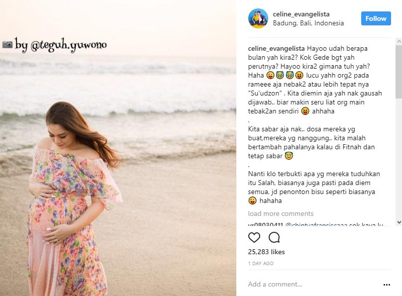 Seolah tak terima dengan tuduhan miring tersebut, Celine pun mulai buka suara. Sambil pamer foto dengan memegang perut buncitnya di pinggir pantai, Celine pun meladeni komentar nyinyir netizen. "Hayoo udah berapa bulan yah kira2? Kok Gede bgt yah perutnya? Hayoo kira2 gimana tuh yah? Haha," tulis Celine dalam caption postingannya beberapa waktu lalu.