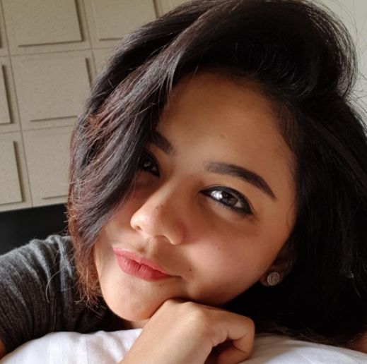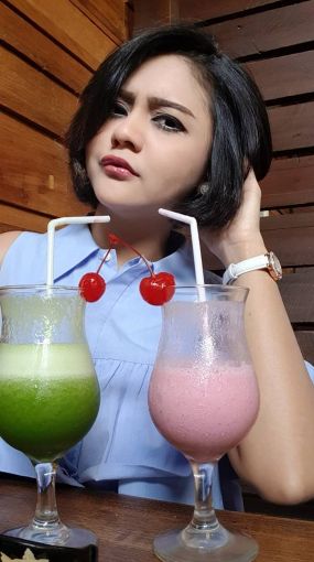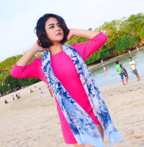 Mengenakan baju berwarna pink cerah, perempuan asal Bandung itu cantik dengan rambut pendek.