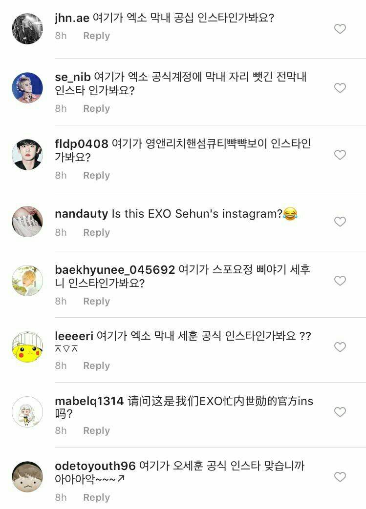 Entah dia terlalu sibuk dengan persiapan comeback atau apa, maknae EXO itu seperti terkejut saat mengetahui grupnya memiliki akun Instagram resmi. Sehun menuliskan komentar, "Apakah ini akun Instagram official EXO?"