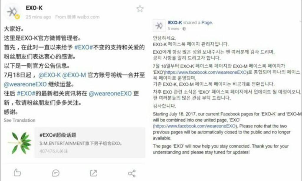 Sebagai gantinya, SM Entertainment merilis akun Facebook dan Weiboo baru yang akan memberikan info dan kabar terbaru boyband hits besutannya itu. Tak lama setelah pengumuman itu dibuat oleh SM Entertainment, banyak fans yang menunjukkan rasa sedih mereka, "Aku tahu saat ini memang tidak ada kedua sub unit itu lagi. Tapi kalian benar-benar membuatku sedih," "Apakah kalian tahu bahwa banyak foto kenangan mereka di sana yang ada sejak debut?!!!"