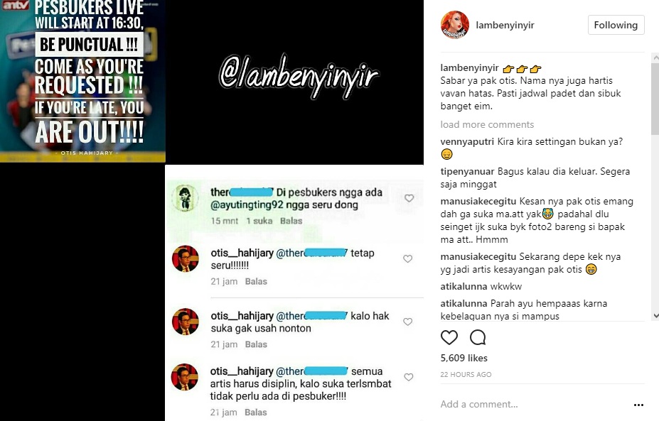 Mengetahui hal tersebut, komentar nyinyir pun membanjiri lapak akun gosip @lambenyinyir yang mengunggah ulang postingan tersebut. "Gx profesional donk namanya mujair mh lebay y," sindir netizen. "Segitunya.... Rating turun ya pak Otis? Hahahhh..." sindir lainnya. "Sombong sih Madonna Depok..haaaa," timpal lainnya.