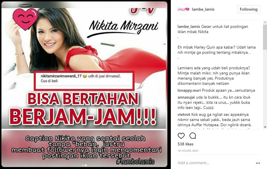 Caption Nikita yang terlihat santai justru lebih mengundang banyak komentar di lapak Instagramnya. "udh di jual dimana2. Cus di beli," tulis Niki.