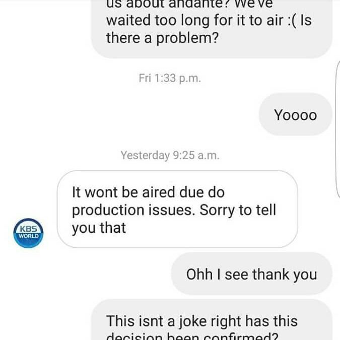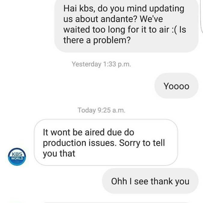 Setelah lama menanti tanggal pasti perilisan drama Kai, fans itu bertanya "Hai, kbs apakah kalian tidak keberatan untuk mengupdate kabar tentang andante? Kami sudah menunggu terlalu lama untuk mengudara :( apakah ada problem?" Lalu pihak KBS membalas "Drama tersebut tidak akan tayang dikarenakan isu produksi. Maaf karena harus memberi tahumu tentang hal ini."