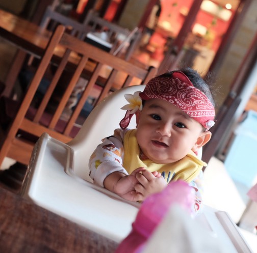 Mengenakan penutup kepala khas Bali, Baby Bambang sungguh menggemaskan dengan senyuman kecil itu bukan?