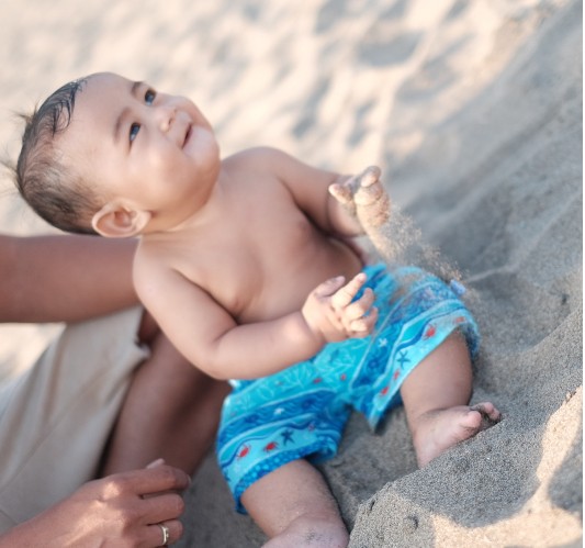 Seru abis! Ini mainan pasir pantai pertama bagi Baby Bambang lho...