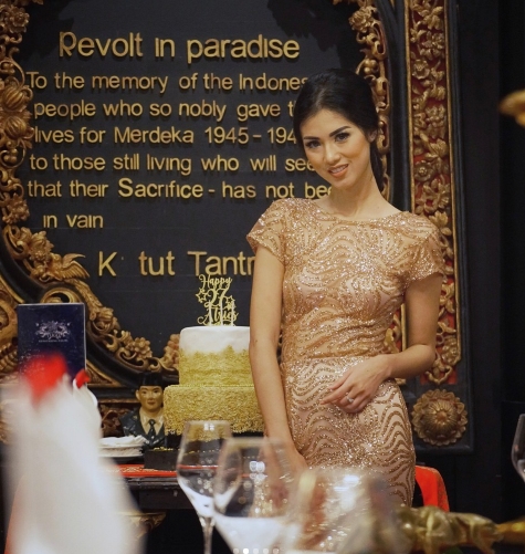 Mengenakan gaun berwarna pastel dengan hiasan glitter cantik, Atries nampak bahagia di hari ulang tahunnya yang ke 27.