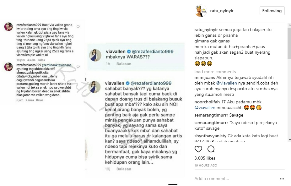 Menurut Via, ia lebih memilih tak mempunyai banyak sahabat jika kenyataannya mereka malah menusuk dari belakang. "sahabat banyak??? yg katanya sahabat banyak tapi cuma baek di depan doang trus di belakang busuk buat apa mba'??? kalo aku sin NO!" balas Via melalui kolom komentarnya.