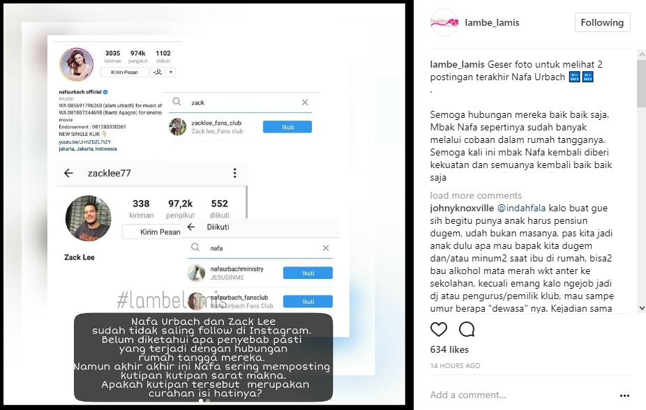 Postingan itu menyebut jika Nafa dan sang suami, Zack Lee sudah tak saling follow di Instagram. Belum diketahui secara pasti apa yang terjadi dengan rumah tangga pasangan yang telah menikah sejak 2007 silam.