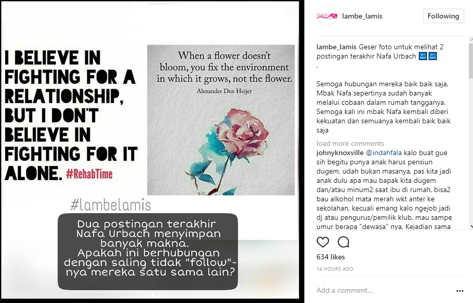 Dua postingan terakhir Nafa pun berhasil mencuri perhatian netizen. Postingan pertama mengisyaratkan bahwa ia tak meyakini perjuangan dalam sebuah hubungan yang dilakukan seorang diri. "I believe in fighting for a relationship, but I don't believe in fighting for it alone," bunyi salah satu postingan Nafa.