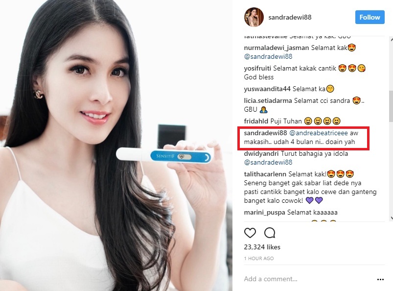 Bahkan, sejumlah netizen sempat merasa tak percaya kandungan Sandratelah memasuki bulan keempat. "Seneng banget dengarnya ce.. Selamat y idolaku.. Kita Nikah di bulan yg sama dan dikasih berkat baby yg memasuki bulan ke 4 .. Sehat sehat ya ce dn dedek," kata netizen. "KAKKKK SERIUS 4 BULANNNNNNN OMGGGGGGGG baby boy or baby girllll??? @sandradewi88," imbuh lainnya.