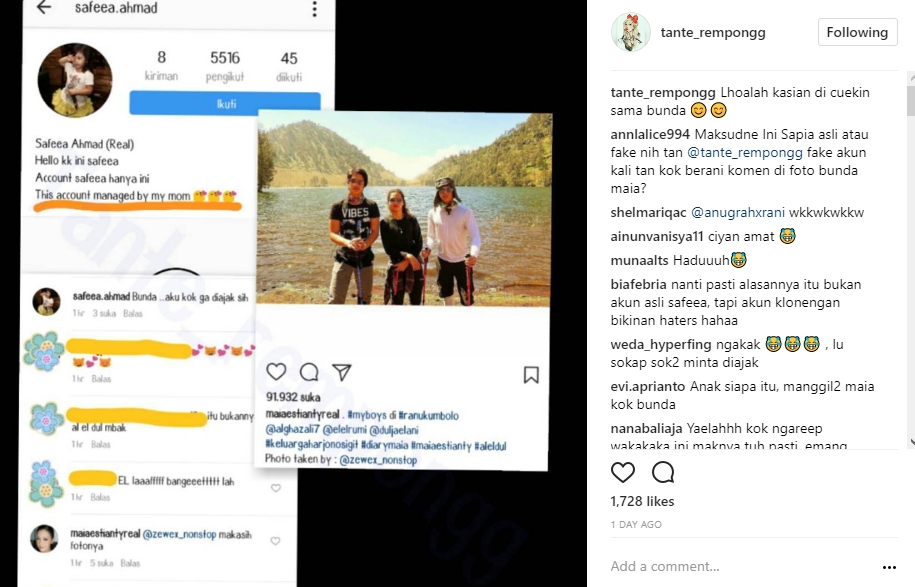 Namun, ada satu komentar netizen yang sangat menarik perhatian. Pasalnya, terdapat akun anak pertama Ahmad Dhani dan Mulan Jameela, Safeea ikut mengomentari postingan Maia. "Bunda ..aku kok ga diajak sih," komentar akun tersebut dalam postingan Maia.