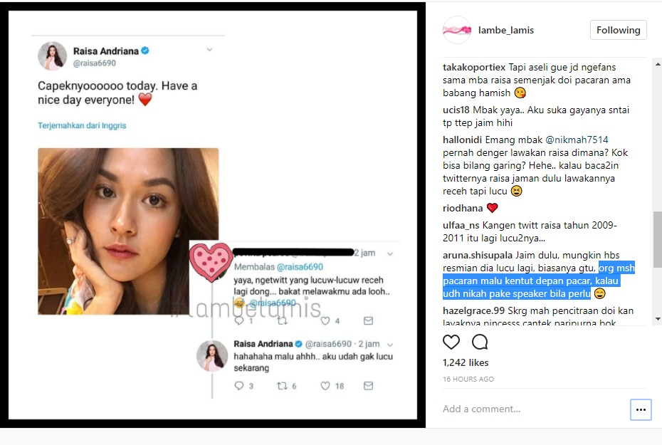 "Iyaaa raisa dlu di twitter ngocol banget, kyknya mulai jaim sejak dia imagenya kalem trus pacaran ma keenan.," komentar akun sarahazaleaa. "Skrg malah ijk liat mulai lepass lagi setelah sama hamish."
