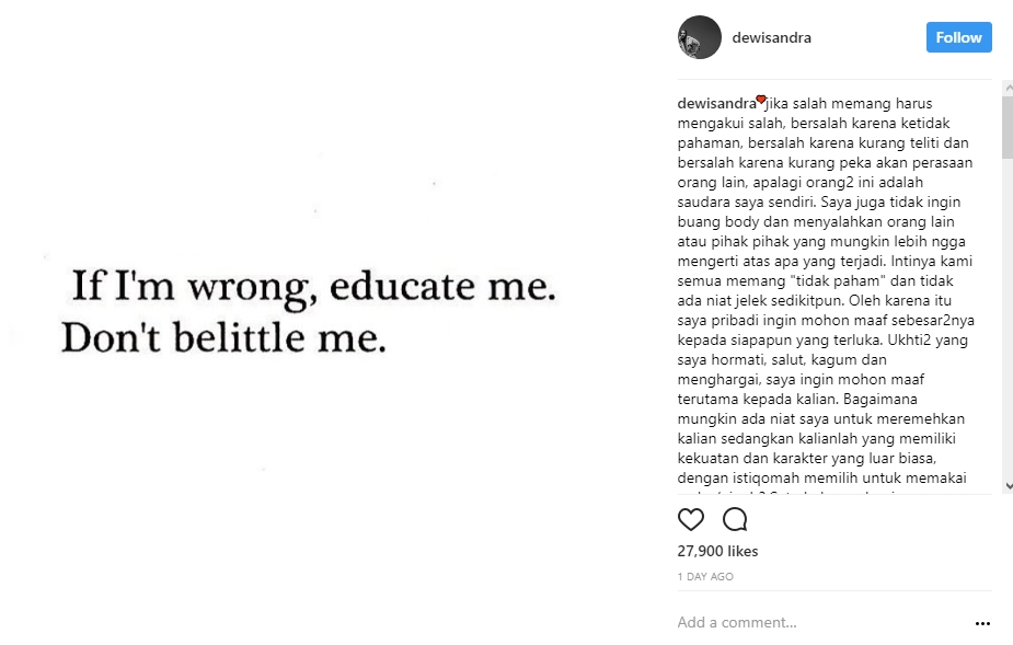 Meskipun banyak komentar pedas yang akan melukainya usai memberi postingan itu, Dewi Sandra mengaku sudah menerima dengan ikhlas. "Dibawah ini akan ada berbagai komentar dan semuanya akan saya terima dengan hati lapang. Yang mau marah, caci maki... silahkan... karena memang saya belum sempurna dalam berpakaian, mungkin akhlak saya, amal saya, ucapan saya maupun perbuatan saya masih banyaaaaak kekurangnya," tuturnya.