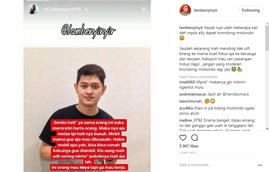 Mengetahui hal tersebut, netizen malah memberi komentar nyinyir. Mereka menyalahkan Ely karena memilih lelaki dengan usia lebih muda. "Duh mamanya jg sih kegenitan suka daun muda," kata netizen. "betul....benurut ku sih yg bego mpok nya....dari awal pasti udah tau lah dia gimana....dipikir aja deh, masa bujang ganteng mau dapetin mpok eli??pantes nya dapetin anaknya," timpal lainnya.