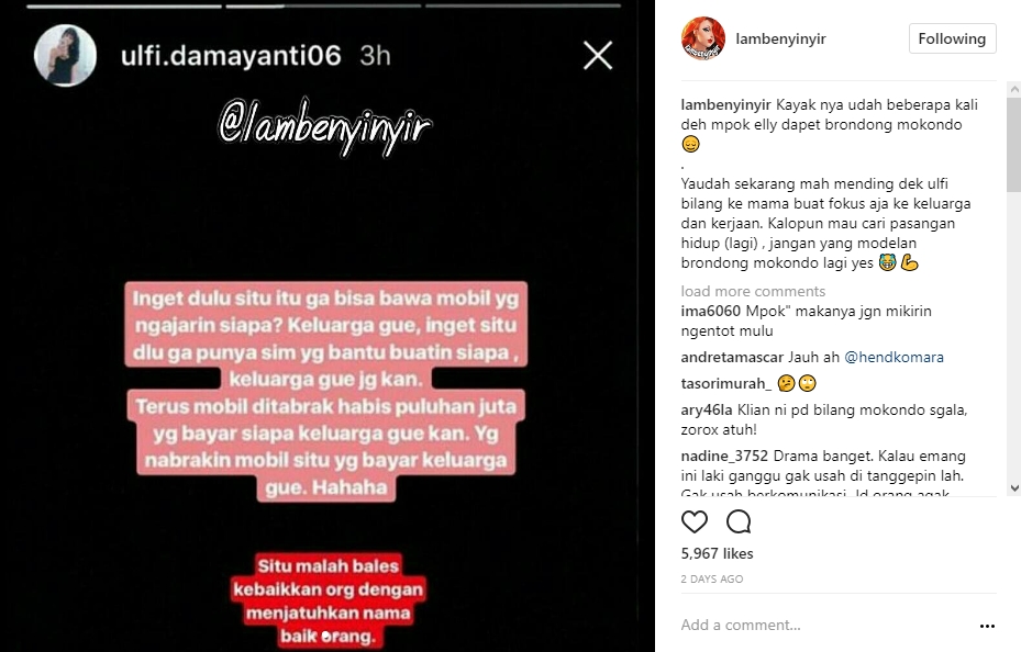 Merasa sang ibu menjadi korban Ferry, putri pertama Ely Sugigi, Ulfi Damayanti pun mengungkapkan kekesalannya. Sambil membagikan foto Ferry melalui Instagram Story miliknya yang diunggah ulang oleh akun @lambenyinyir, Ulfi mengungkapkan bahwa mantan suami sang ibu memiliki hati yang buruk. "Gekns hati' ya sama orang ini suka merorotin harta orang. Muka nya aja melas tpi hati nya busuk," tulis Ulfi.