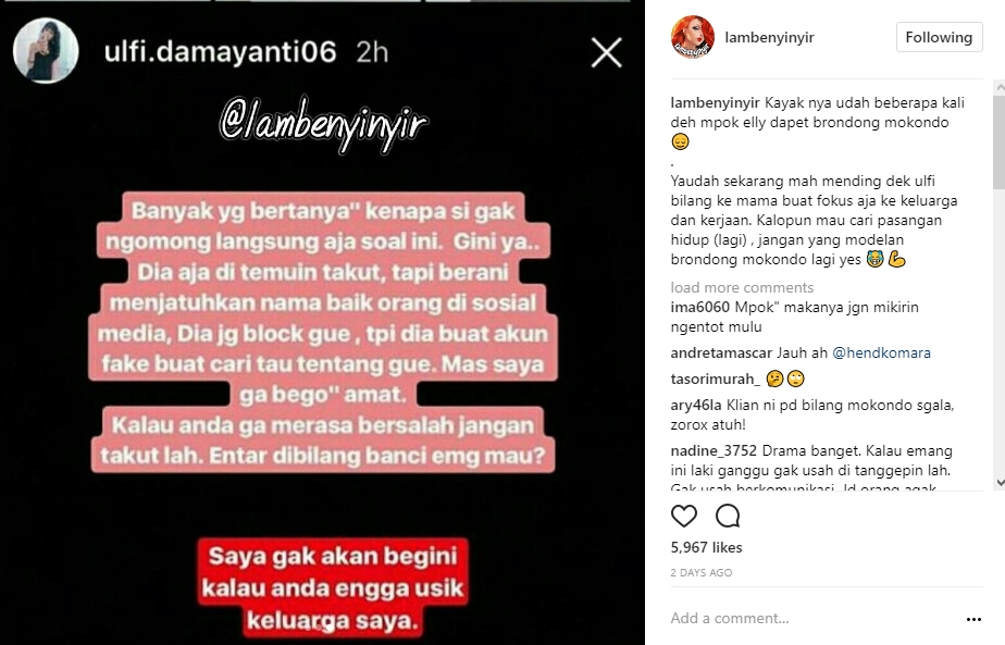 Tak hanya itu, Ferry bahkan sudah berani untuk membuat akun palsu demi mencari tahu tentang Ulfi. "Dia jg block gue, tpi dia buat akun fake buat cari tau tentang gue. Mas saya ga bego" amat. Kalau anda merasa bersalah jangan takut lah. Entar dibilang banci emg mau?" imbunya.