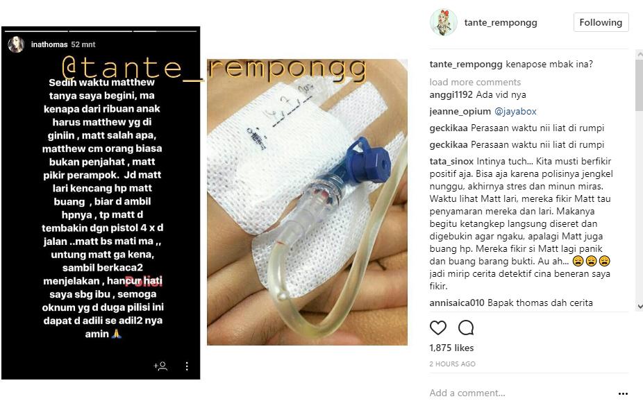 Sementara itu, Axel menceritakan kejadian yang sebenarnya pada sang ibu. Menurut Axel, hal tersebut terjadi karena terjadi kesalahpahaman. "matthew cm orang biasa bukan penjahat, matt pikir perampok. Jd matt lari kencang hp matt buang , biar d ambil hpnya," tulis Ina melalui Instagram Story yang diunggah ulang oleh akun @tante_rempongg.
