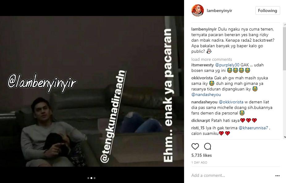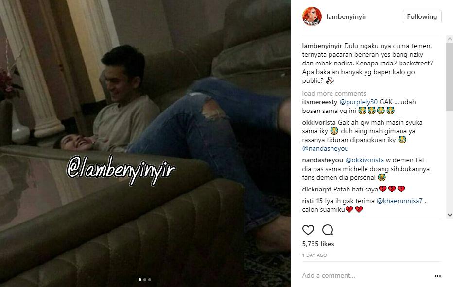 Sebelumnya, keduanya mengaku hanya sekedar teman. Namun, kini terlihat jelas seperti apa hubungan keduanya. "Dulu ngaku nya cuma temen, ternyata pacaran beneran yes bang rizky dan mbak nadira. Kenapa rada2 backstreet? Apa bakalan banyak yg baper kalo go public?" tulis akun @lambenyinyir dalam caption postingannya.