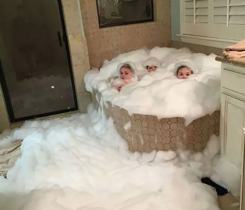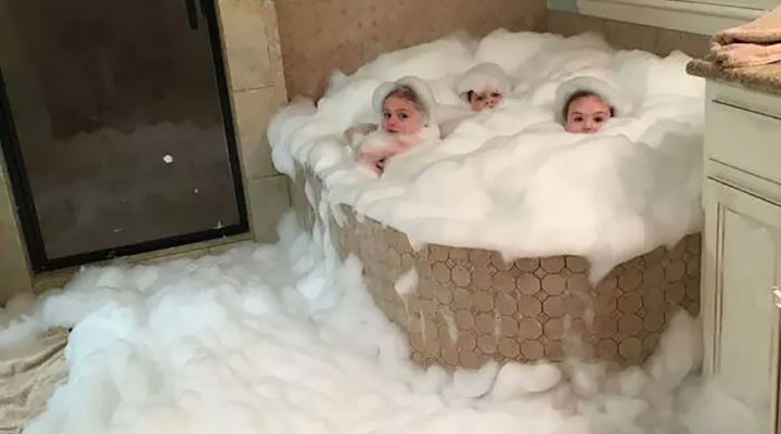 Ketika anak-anak mandi tanpa pengawasan orang tua, hal seperti ini bisa terjadi. Busa sabun menyebar memenuhi kamar mandi.