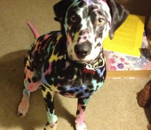 Inilah mengapa orang tua sebisa mungkin tidak meninggalkan anak balitanya sendiri dengan anjing peliharaan di rumah. Bisa-bisa anjingnya sudah diwarnai seperti ini.