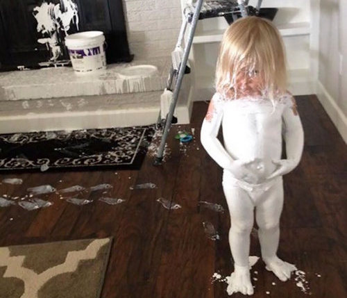 Anak ini membuat orang tuanya terkejut karena telah mencelupkan diri ke dalam cat yang ia kira tempat mandi yang seru. Alhasil seluruh badannya menjadi warna putih.