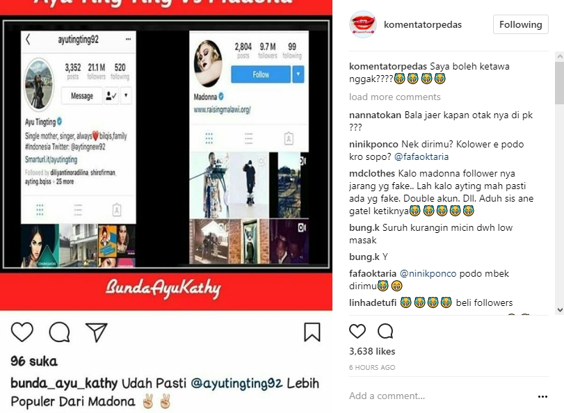 Tak hanya itu, netizen bahkan menuding Ayu hanya mempunyai pengikut palsu, berbeda dengan Madonna. "Kalo madonna follower nya jarang yg fake.. Lah kalo ayting mah pasti ada yg fake. Double akun. Dll. Aduh sis ane gatel ketiknya," sindir netizen. "beli followers," sindir lainnya. "Followersnya jual buah pulm semua," timpal lainnya.