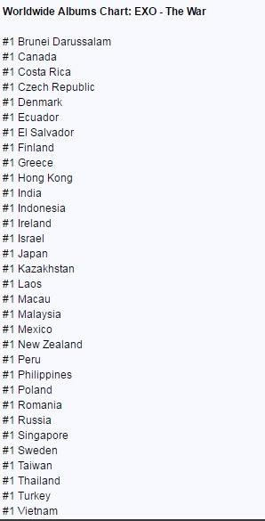 Full-album keempat EXO itu juga mengambil alih berbagai chart musik di seluruh dunia dan sukses merajai iTunes Group Albums Chart teratas di 34 negara termasuk Kanada, Yunani, Jepang, Meksiko, Swedia, Vietnam, Finlandia, Israel, Makau, Peru, Rumania, Taiwan, dan masih banyak lagi. Hal ini menjadi sebuah rekor baru yang berhasil dipecahkan oleh EXO untuk penjualan album terbanyak yang pernah diraih oleh boyband Korea. Selamat EXO!