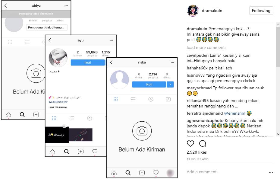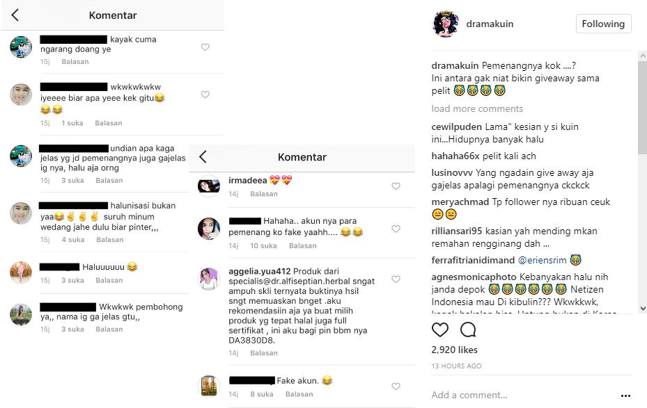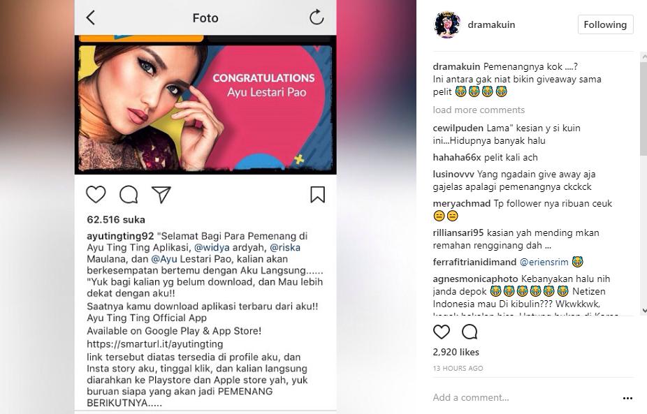 Namun, rupanya akun pemenang kuis Ayu Ting Ting adalah palsu. Hal ini pun mengundang sindiran pedas dari netter. "Mungkin efek slh pnulisan min maklumin att kn masih bljar ngetik min wkwkwkkk" sindir netizen melalui kolom komentar akun @dramakuin. "Pemenangx makhluk halus kali min hhaahhaa masa IGx kaya abal2 gitu sih yesss," sindir lainnya.