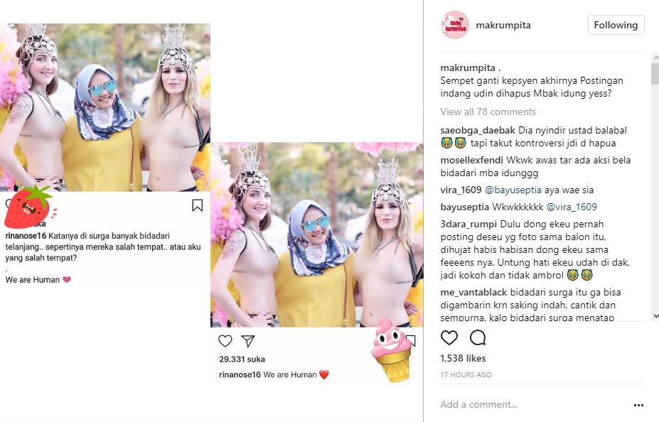 Postingan yang diunggah ulang oleh akun gosip @makrumpita itu menampilkan Rina saling merangkul dengan kedua bule cantik yang bertelanjang dada. Posisi Rina yang berada di tengah dua wanita bule itu sangat kontras. Apalagi, saat itu Rina Nose mengenakan hijab.