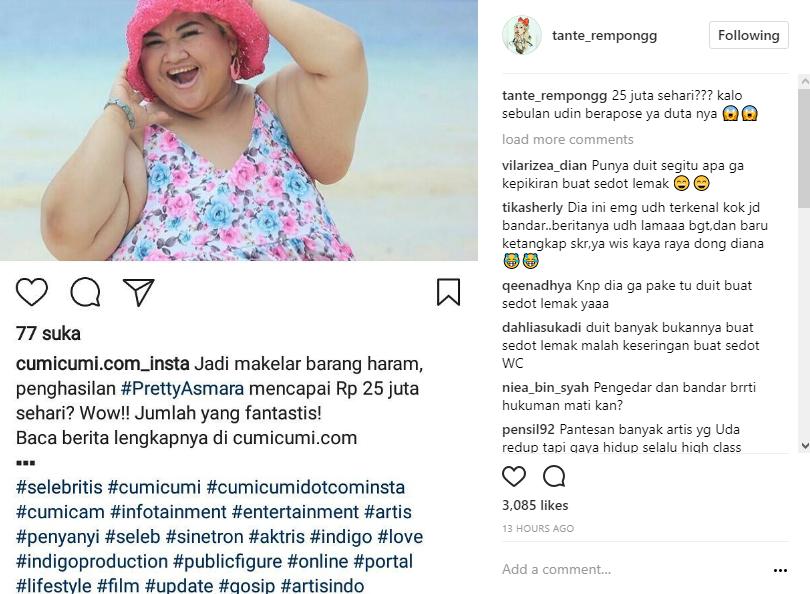 Mengetahui kabar tersebut, tak sedikit netizen yang mengaku kaget. "Wow 750 jt perbulan!!! Nikmatilah hari harimu di jeruji besi!!!" sindir netizen melalui kolom komentar akun @tante_rempongg. "25jt sehari???? waaaahhh dh bs sedot lemak tuuuhh !!" sindir lainnya. "WTF! 25 jt kalahin gaji presiden .. sdh jarang keliatan ditv mungkin itu penyebabx terpaksa cari nafkah dr penjualan barang haram itu," timpal lainnya.