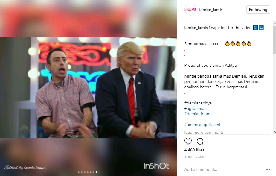 Sementara itu, di sesi terakhir penayangan rekaman video, netizen lebih tertarik pada sosok yang mirip dengan Presiden Amerika Serikat, Donald Trump. "itu donal trump apa," ujar netizen."proud of you Demian.. btw itu Donald Trump beneran apa KW nih? srius tanya lho," timpal lainnya.