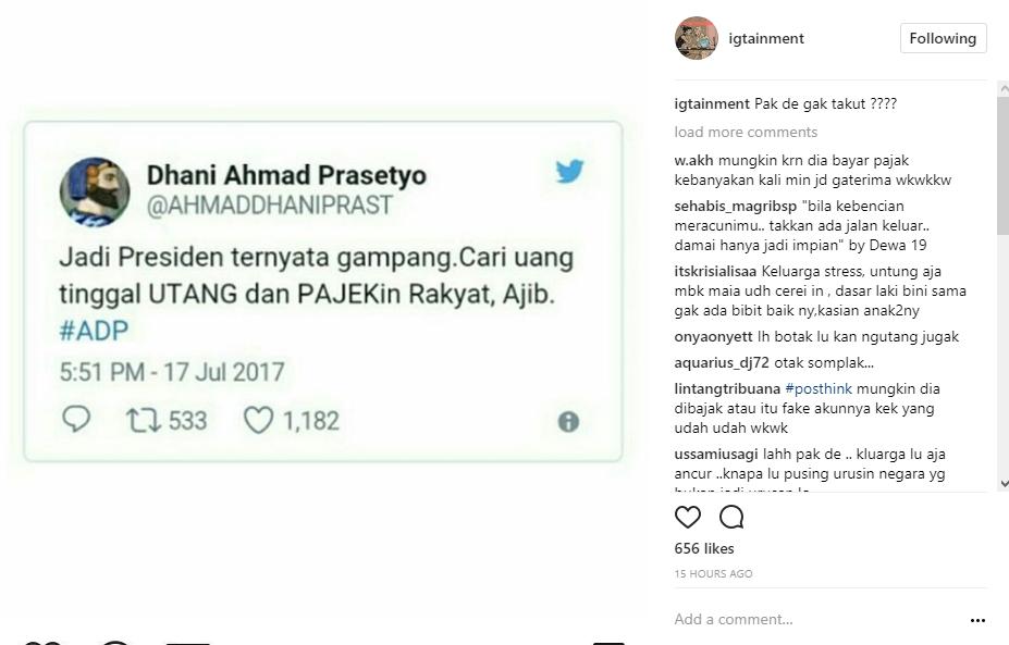 Seolah tak takut pada hukuman sosial yang dilayangkan publik padanya, Dhani malah menghina Presiden jokowi melalui akun Twitternya belum lama ini. Dengan kata-kata tajamnya, ayah lima anak itu menuding Presiden Jokowi mengambil jalan pintas dengan berhutang untuk kepentingannya sendiri. "Jadi Presiden ternyata gampang.Cari uang tinggal UTANG dan PAJEKin Rakyat, Ajib. #ADP," tulis Ahmad Dhani dalam postingan di akun Twitternya.