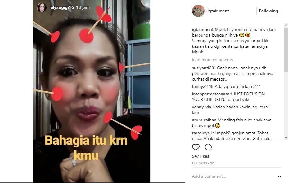 Tak hanya itu, filter yang digunakan dalam postingannya itu pun seolah memperlihatkan bahwa Ely tengah berbunga-bunga. "Mpok Elly roman romannya lagi berbunga bunga niih ye Semoga yang kali ini serius yah mpokkk kasian kalo dgr cerita curhatan anaknya Mpok," tulis akun @igtainment dalam caption postingannya.