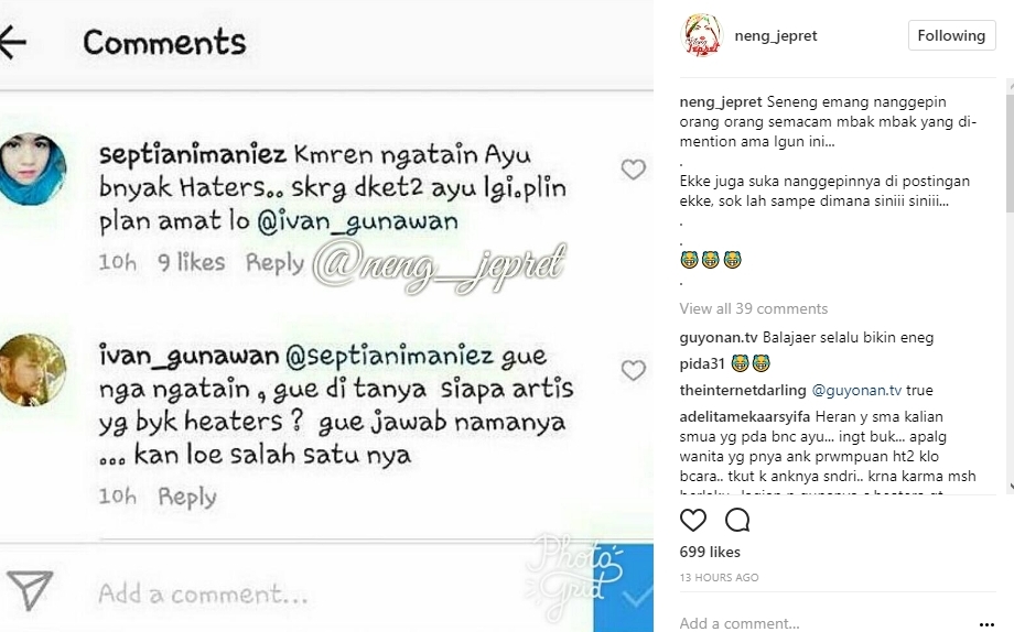 Beberapa komentar di postingan lain Igun pun netizen masih membahas hubungan Igun dan Ayu Ting Ting. Namun, salah satu komentar netizen malah membuat Igun naik darah. Pasalnya, ia menuding Ayu adalah salah satu selebritis yang mempunyai banyak haters. "Kmren ngatain Ayu bnyak Haters.. skrg dket2 ayu lgi.plin plan amat lo @ivan_gunawan," tulis netizen.