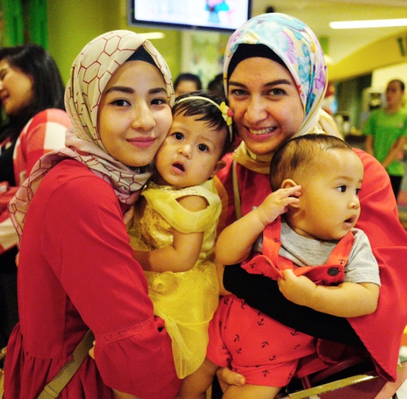 Ibu-ibu muda ini nampaknya reunian setelah punya anak nih. Sambil menggendong buah hatinya Nina Zatulini juga pakai dresscode senada berwarna merah.