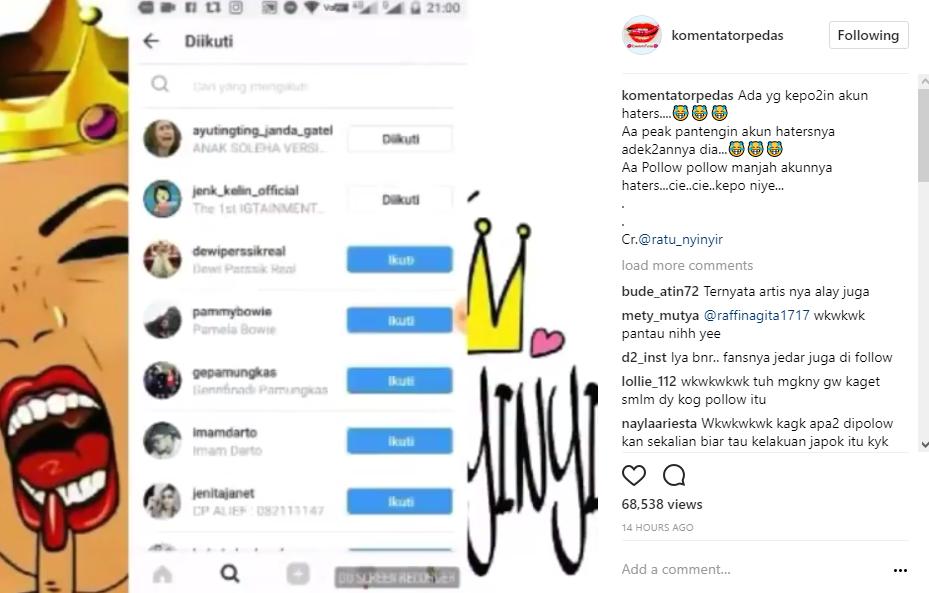 Melalui postingan akun @komentatorpedas, Raffi malah kepergok mengikuti akun haters Ayu Ting Ting. "Ada yg kepo2in akun haters.... Aa peak pantengin akun hatersnya adek2annya dia... Aa Pollow pollow manjah akunnya haters...cie..cie..kepo niye..." tulis akun tersebut dalam caption postingannya.