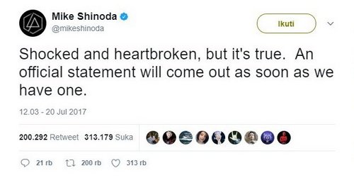 "Terkejut dan patah hati, tapi itu benar. Pernyataan resmi akan keluar segera setelah kami memilikinya," kata Mike Shinoda, rekan satu band Chester Bennington di Linkin Park.