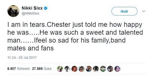 Musisi Amerika yang juga merupakan bassis dari band rock Motley Crue, Nikki Sixx, mengaku tak kuasa menahan tangis setelah mendengar kabar Chester Bennington meninggal dunia karena bunuh diri.