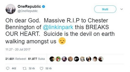 Grup musik Pop Rock Amerika, OneRepublic, sangat sangat sedih atas tindakan bunuh diri yang dilakukan Chester Bennington.